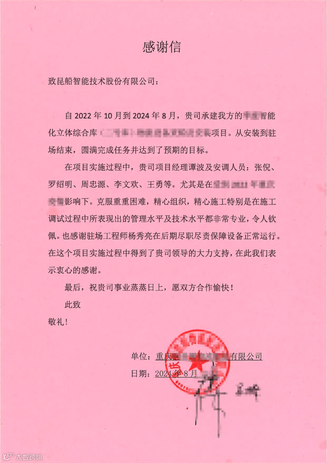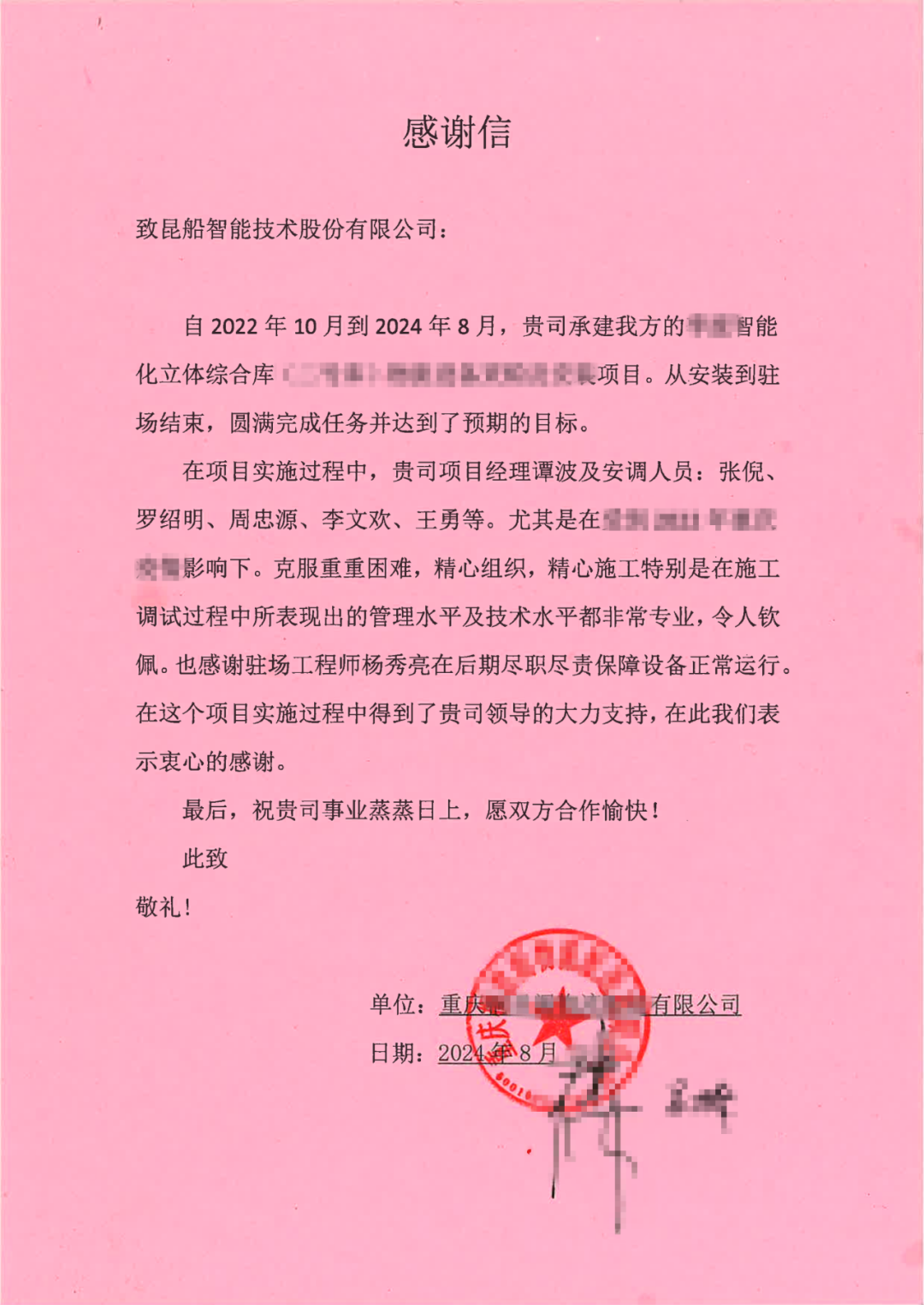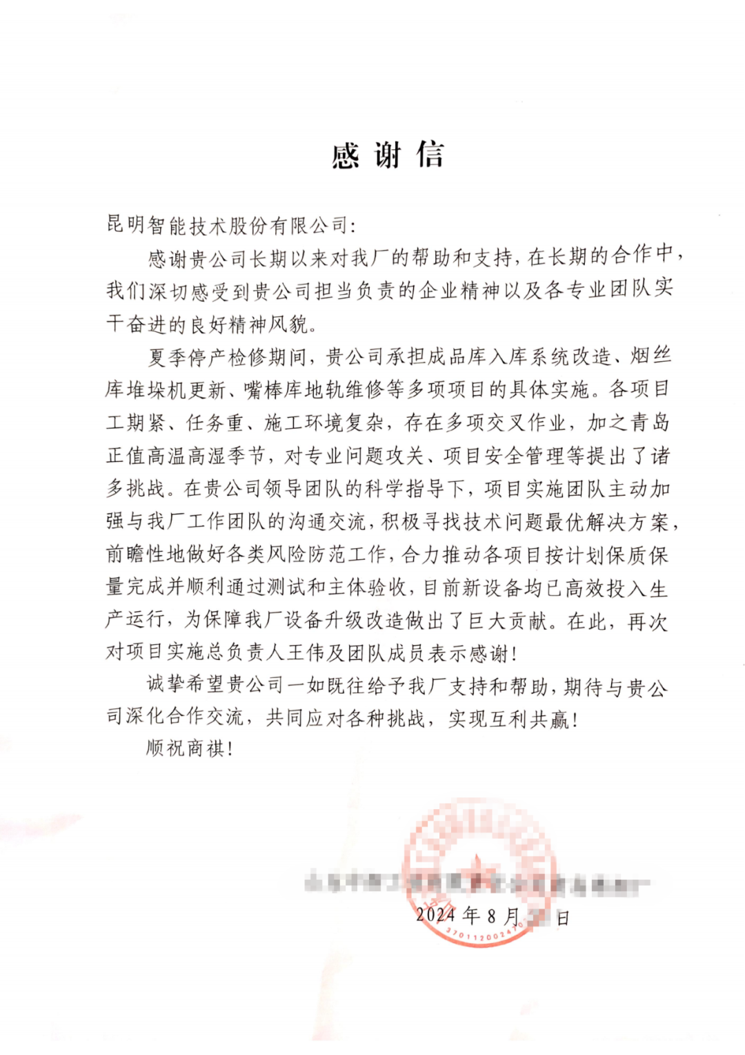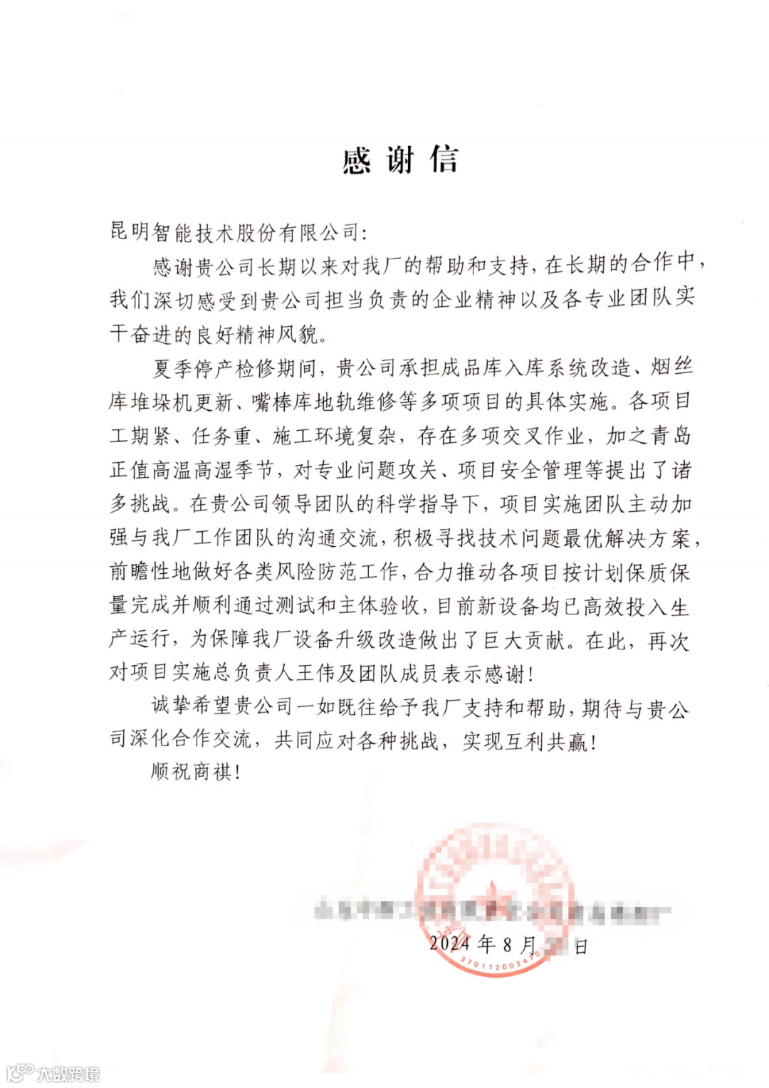 近日,昆船智能公司接连收到重庆某项目、青岛某项目的感谢信。