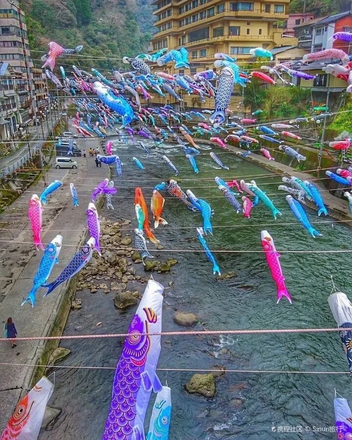 4月10日-5月11日期间,当地还举办了“溪流鲤鱼旗”活动,晚上,鲤鱼旗会亮起灯光,站在温泉街中心的月见桥上观望,更加梦幻。