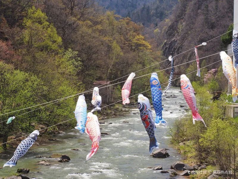 坐落于札幌市南区的定山溪温泉,也在丰平川的溪流上方,挂上了400多条鲤鱼旗,基本都是当地居民捐赠的,希望孩子们遇到挑战能够像鲤鱼跃龙门一样逆流而上克服它们。