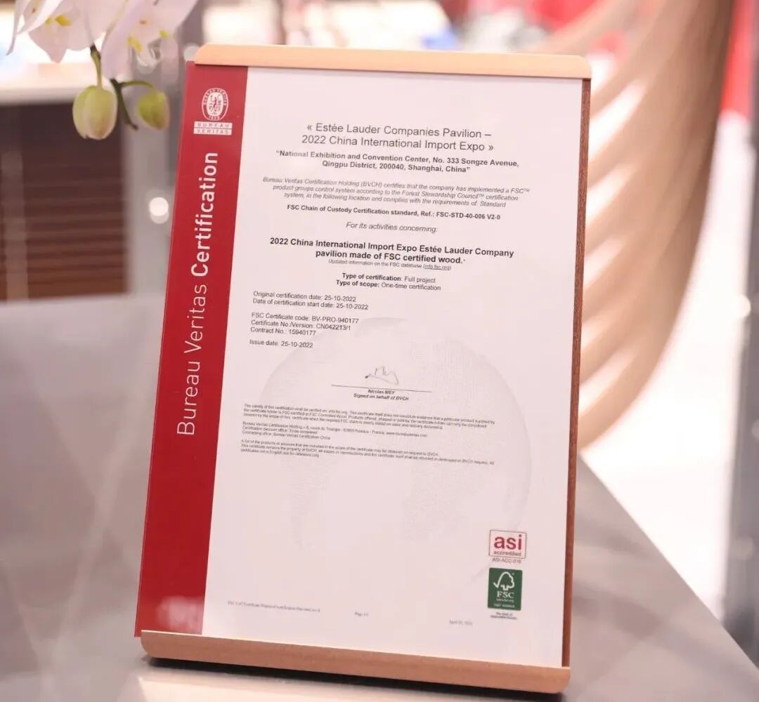 可持续发展一直是雅诗兰黛集团战略的重要组成部分,为凸显对可持续发展理念的贯彻,雅诗兰黛集团今年的进博会展馆采用FSC®(森林管理委员会)认证的木质材料建造而成,并获得了由必维集团(Bureau Veritas,以下简称“必维”,FSC®A000504)颁发的中国首张FSC项目认证证书。与此同时,包括木材和钢结构在内的建材也将被回收,并通过技术创新和环保行动,来抵消展会期间的碳排放,进而令雅诗兰黛集团展馆成为本届进博会消费品展区的首个“零碳展馆”。