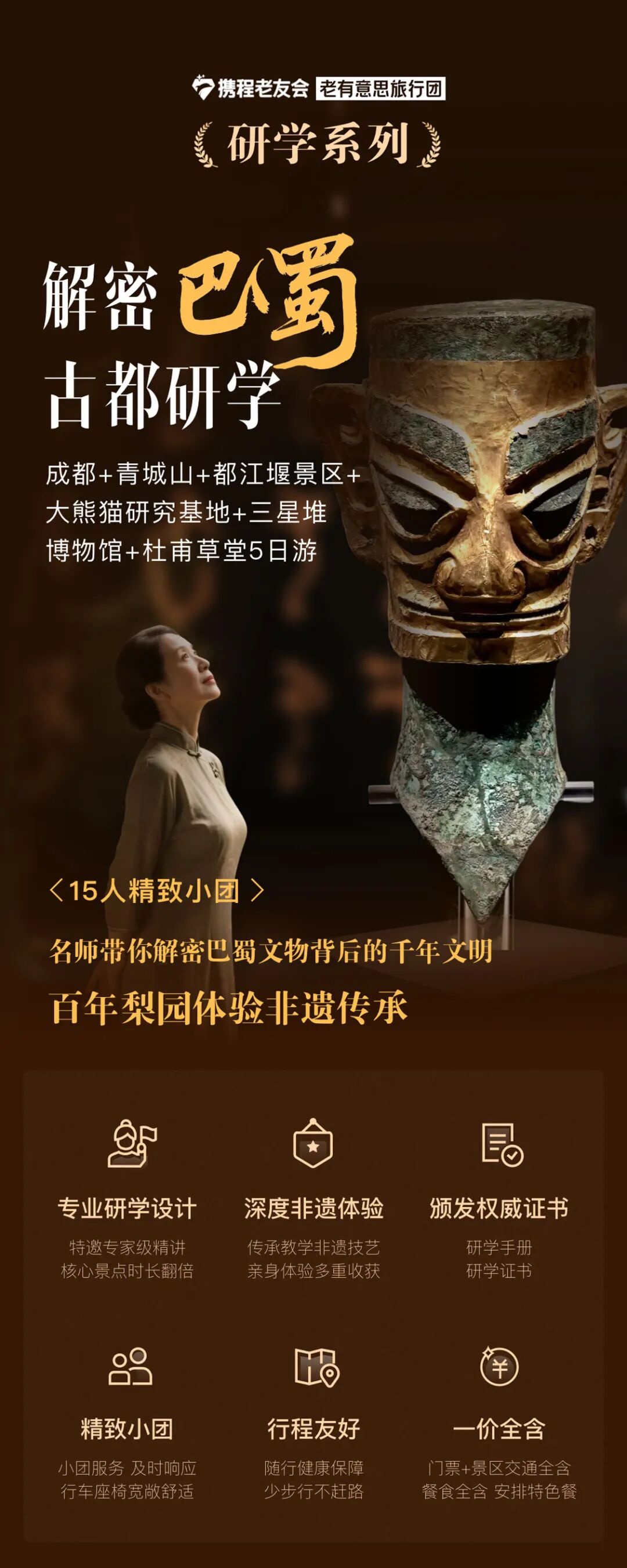 当其他旅行团还在带着游客在宽窄巷子拍照打卡时,走马观花地游览景点,我们的巴蜀研学路线将会带大家走进成都的文化深处,来一次穿越三千年的文明对话。