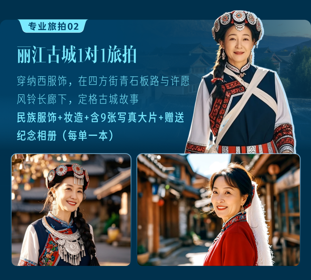 然后再在丽江古城拍一组民族风写真,一次旅行把两种风格都体验个遍,不留遗憾。