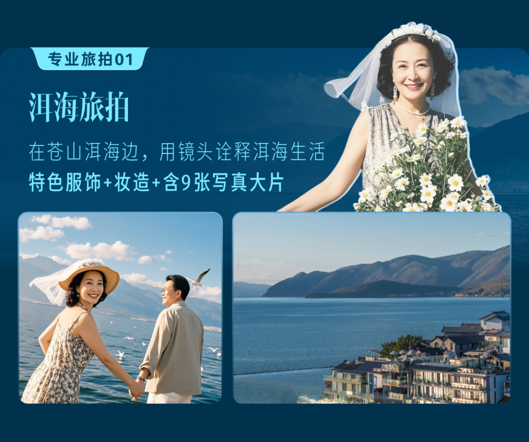 非常非常推荐在洱海选择轻婚纱的造型,带上老伴,换上西装和一袭轻盈白纱,裙摆随风飘动,与苍山的雪、洱海的蓝相映成趣,年轻时没拍婚纱的遗憾,现在补上!