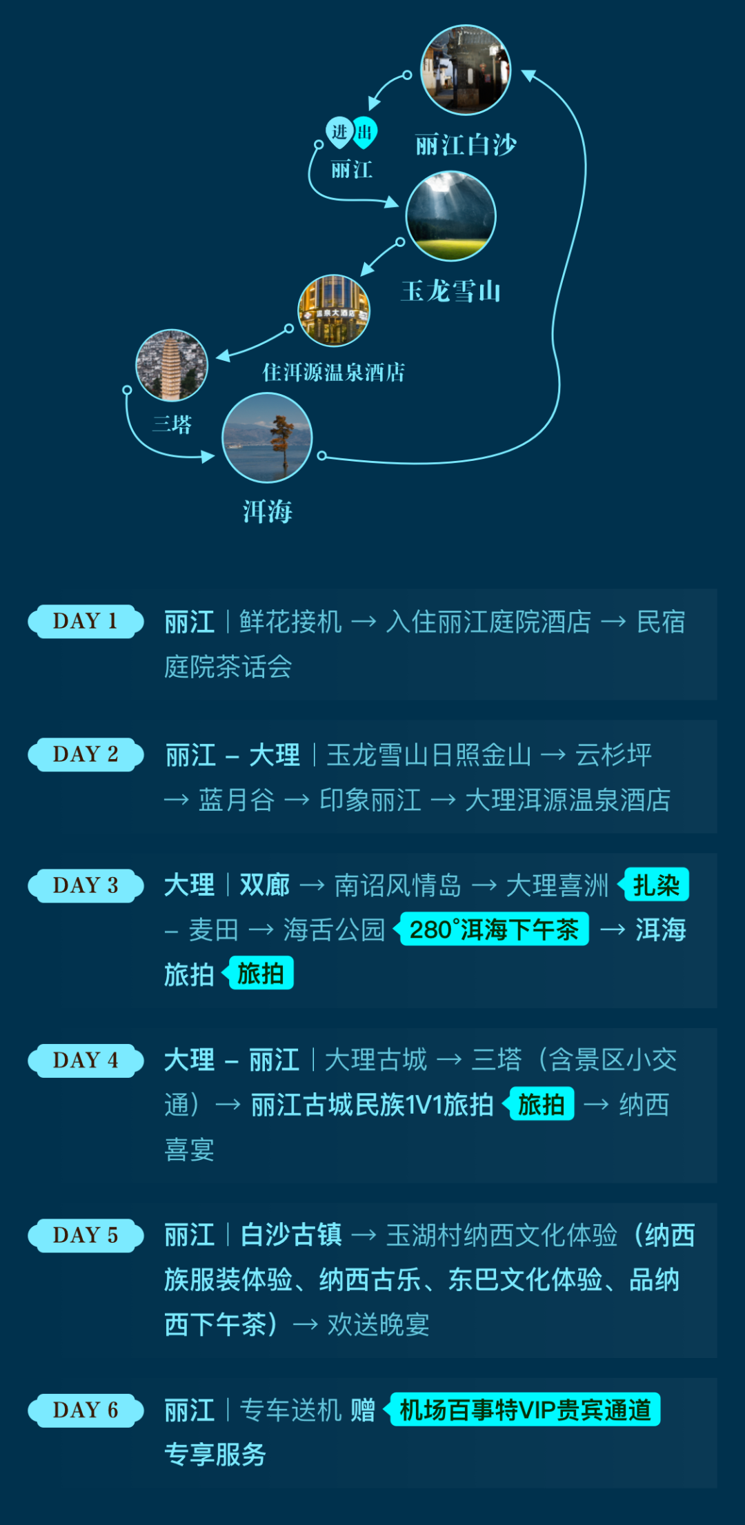 具体的每日行程可以看下面,整个行程即安排了玉龙雪山、大理古城、丽江古城这些经典景点,又加入了很多有层次的深度玩法、松弛不累的适老体验。