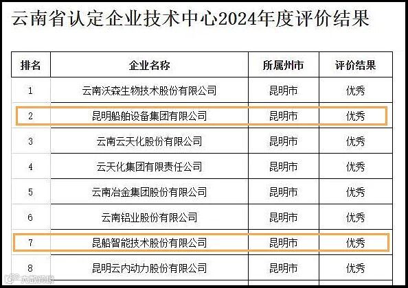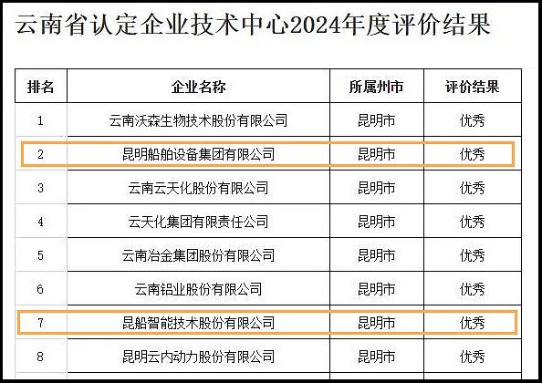 近日,云南省工信厅公布云南省企业技术中心2024年度评价结果,昆船公司及所属单位在此次云南省497家省级企业技术中心评价中表现突出,成绩斐然。其中昆船公司连续8年在企业技术中心评价中稳居“优秀”行列,综合排名第2;所属昆船智能公司评价结果为“优秀”,综合排名第7;昆船电子公司评价结果为“良好”,排名205;昆船机械公司企业技术中心2024年新认定为云南省企业技术中心。