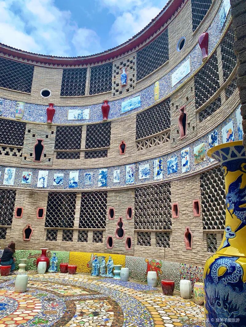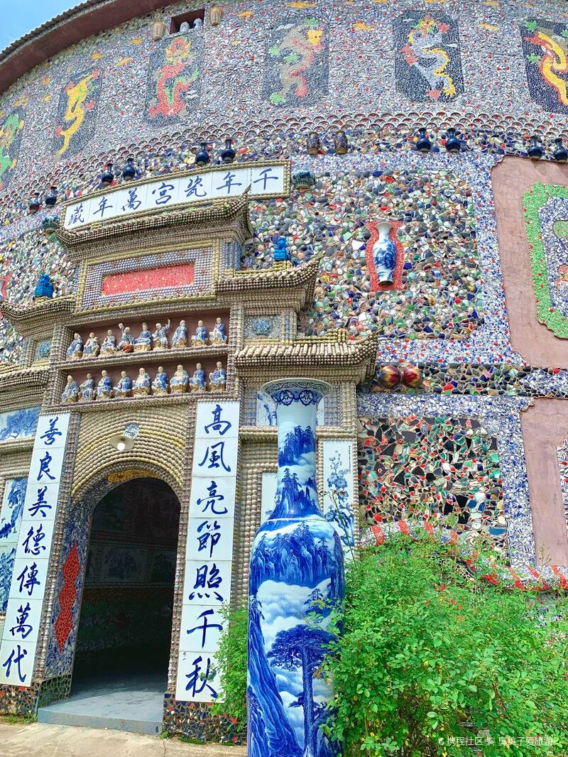远远望去,瓷宫的外型好似客家土楼,走进才能看到,整栋建筑上镶嵌着大小、颜色各异的瓷片、瓷瓶、瓷盘,其中甚至包括景德镇四大名瓷:青花、玲珑、粉彩和颜色釉,瓷器大多一半嵌入墙体,裸露出的部分互相组合成各种造型,风格大胆粗犷又别出心裁。