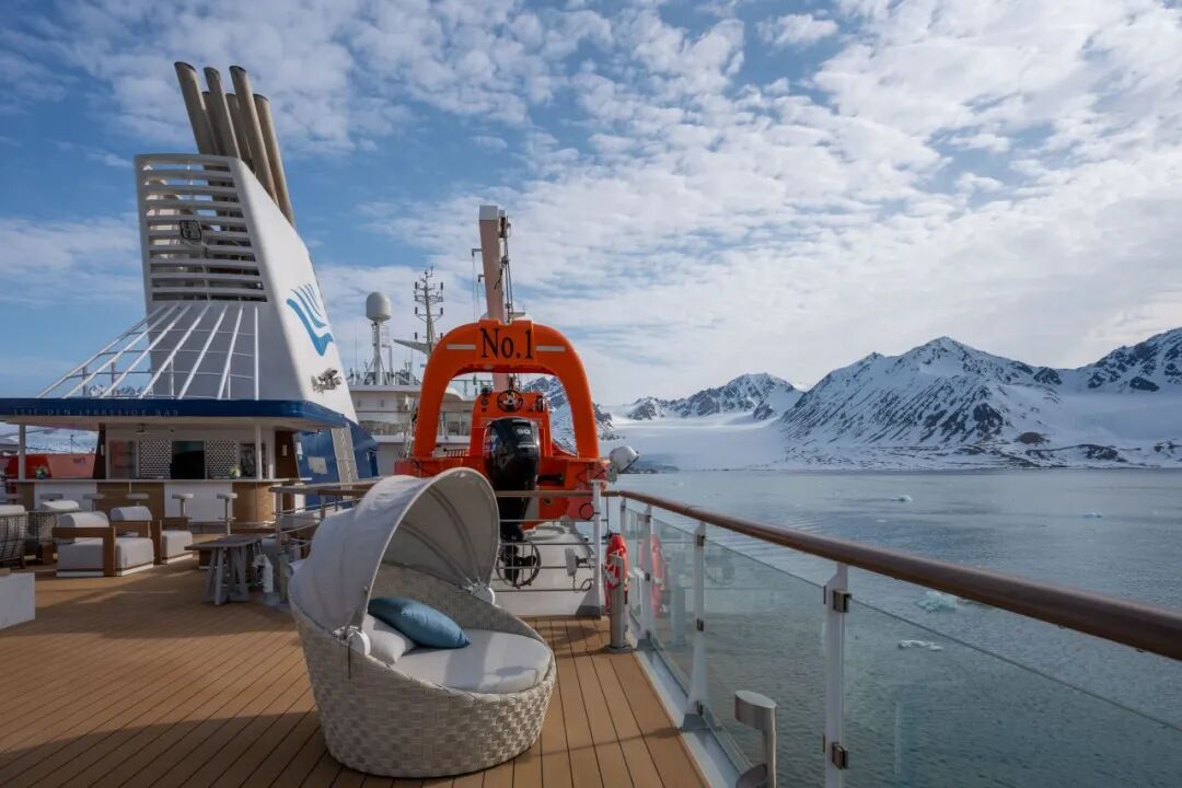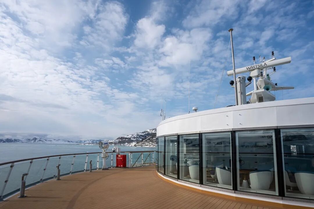 5层甲板则别出心裁地设置了可伸缩液压平台,你几乎可以贴近北冰洋的海面,距离近到仿佛将被深邃的大海吞噬。