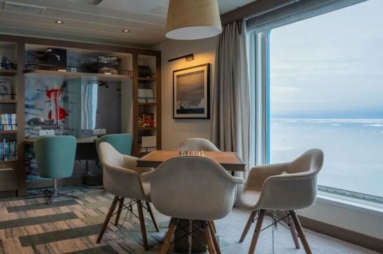 邮轮上总共有4类套房,面积在32㎡到52㎡不等,所有房间均配有巨型观景窗,在任何时间都能将北极海景一览无余,这在极地邮轮中几乎是首创。