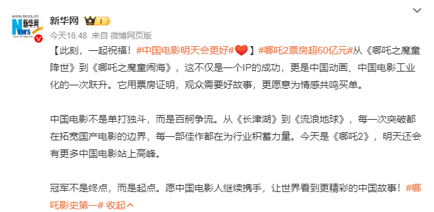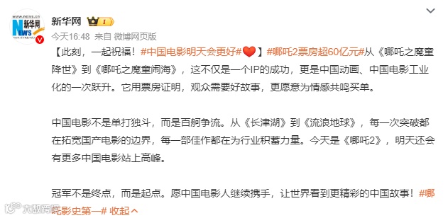 据网络平台数据,截至2025年2月6日,《哪吒之魔童闹海》总票房已突破60亿元,超过了《长津湖》,仅用9天,成为中国影史票房第一!