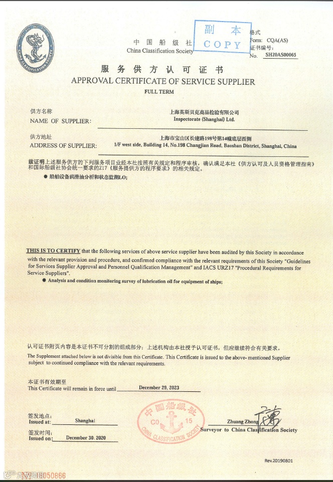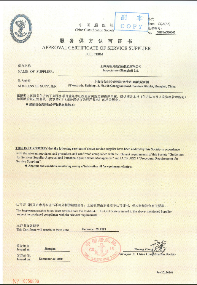 2020年12月30日,必维集团上海英斯贝克商品检验有限公司位于上海市宝山区的石化实验室获得了由中国船级社(CCS)签发的“船舶设备润滑油分析和状态检测LO”服务供方认可证书。