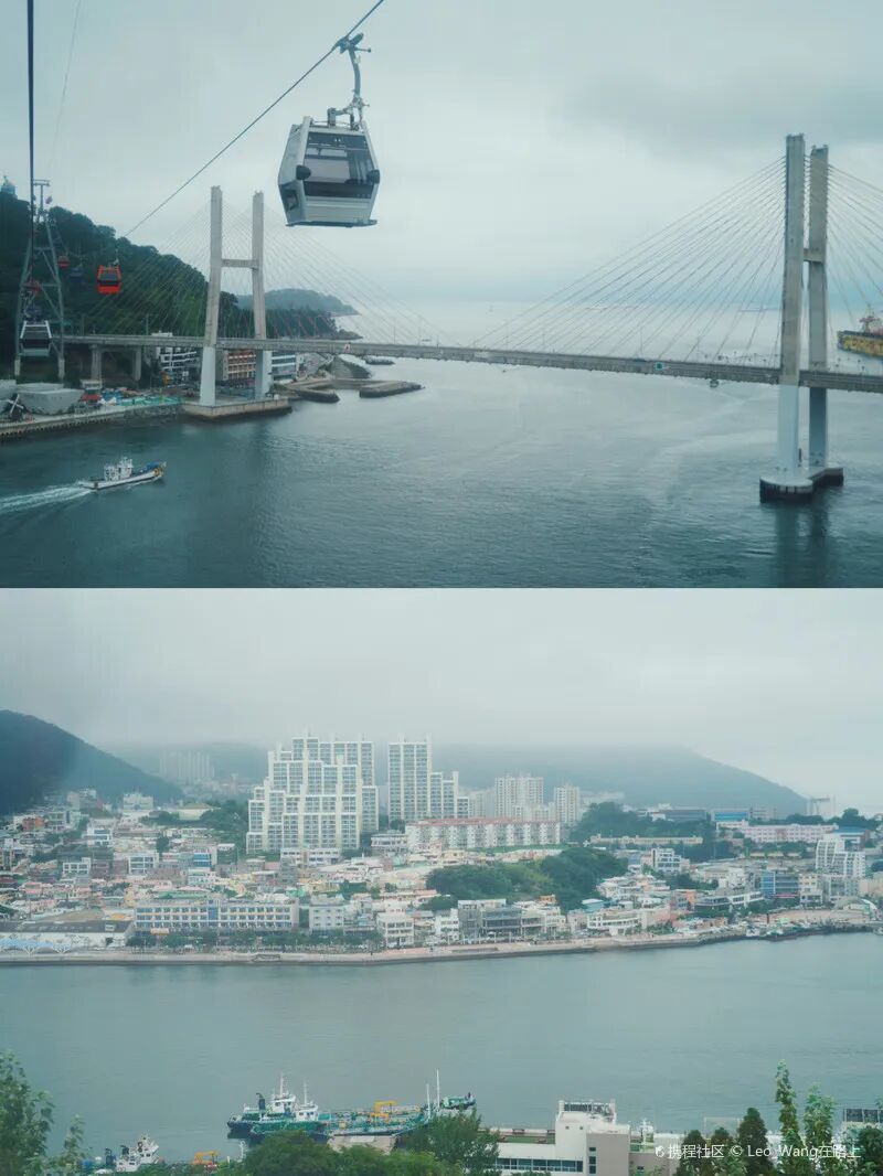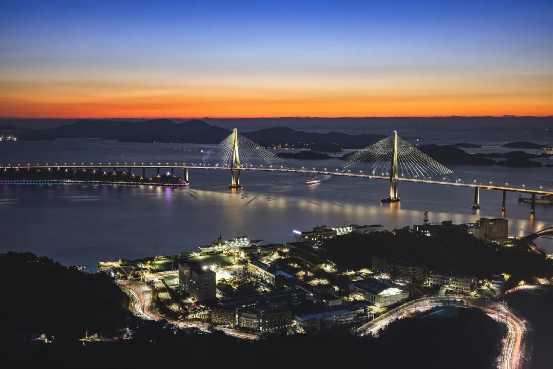 若不想徒步,可搭乘缆车直达儒达山顶峰,待鹤楼、达成阁、儒仙阁、逍遥亭等可供观景。日落时分,夕阳铺洒在多岛海,波光璀璨。山下的木浦大桥也点亮灯光,夕阳和灯火交替融合的那一刻,十分华丽、耀眼。