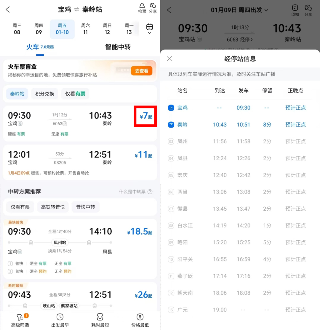 票价:宝鸡—秦岭¥7/人起(至广元全程需要¥39.5/人起)
