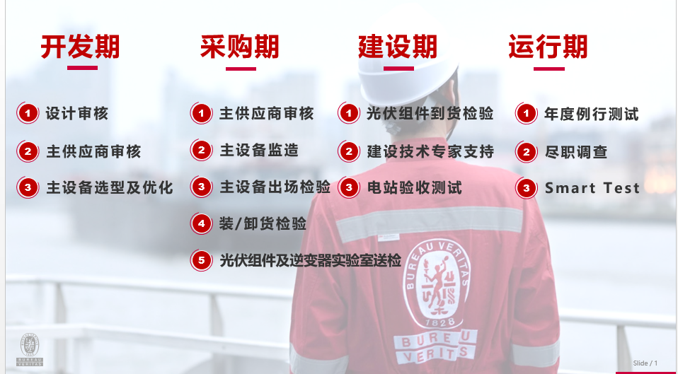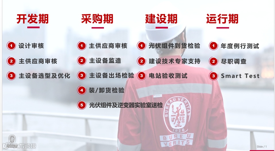 伴随光伏工艺技术的不断进步和成本改善,光伏发电已成为全球清洁、低碳、同时具备价格优势的新能源形式。在碳中和的目标指引下,光伏发电更是开启了新一轮的稳健增长。但同时市场对光伏产品的质量及性能也提出了更高的要求,贯穿光伏电站全产业链的必维集团一站式质量监控和检测服务应运而生。必维为客户提供光伏太阳能电站风险质量管理服务,从项目开发期、采购、建设及运营四个阶段提供一站式服务,完整覆盖太阳能电站的全生命周期。