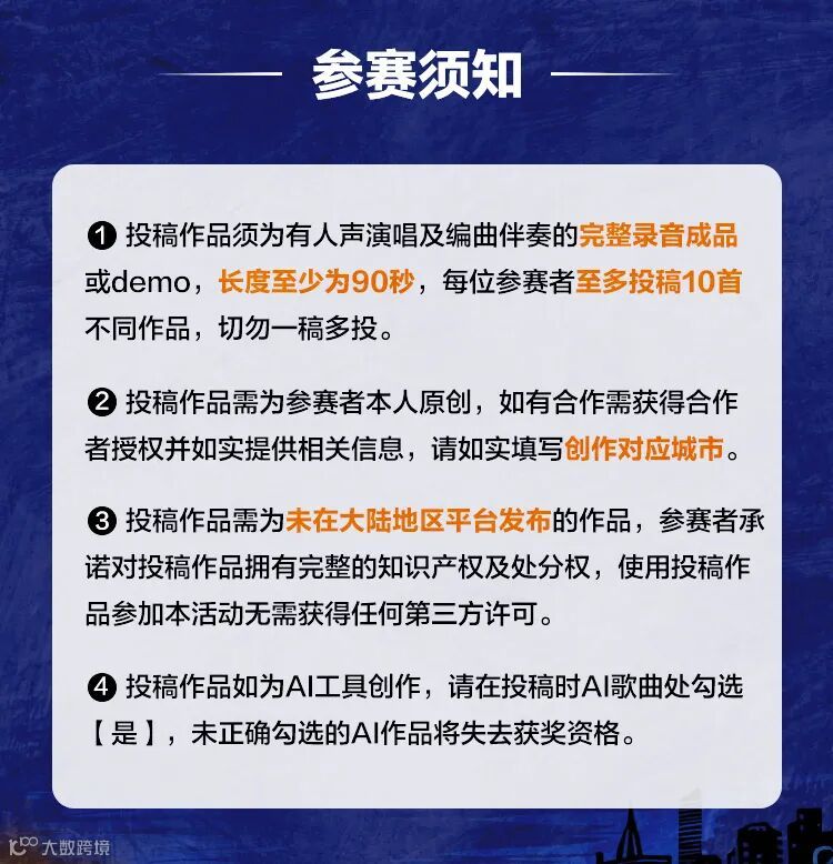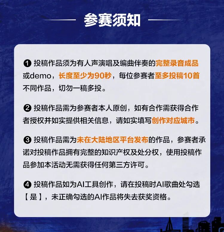 投稿作品需为有人声演唱及编曲伴奏的完整音频,长度至少为90秒;