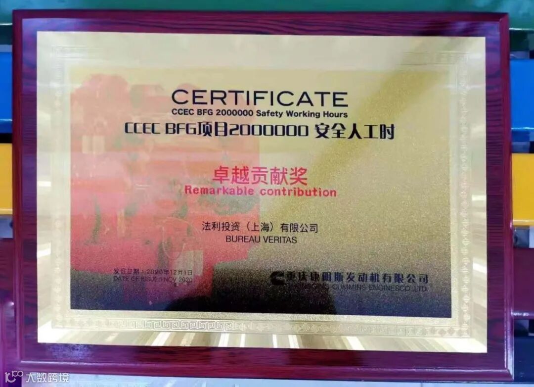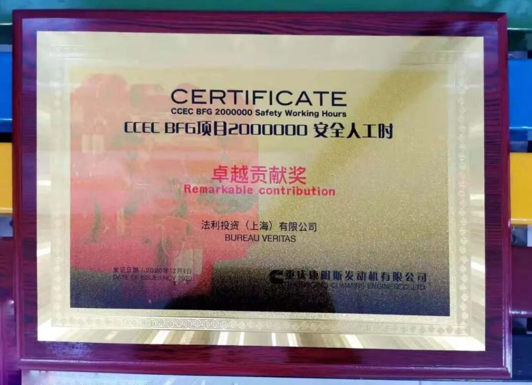 2020年12月1日,必维集团受重庆康明斯大马力发动机技术研发中心及发动机生产线项目(二期) 项目(以下简称:重庆康明斯BFG 项目)业主的表彰,颁发了“CCEC BFG 项目200万安全人工时卓越贡献奖”及“CCEC BFG 项目安全管理卓越贡献奖”纪念奖牌,向必维集团在此项目提供HSE的专业服务及贡献给予肯定。