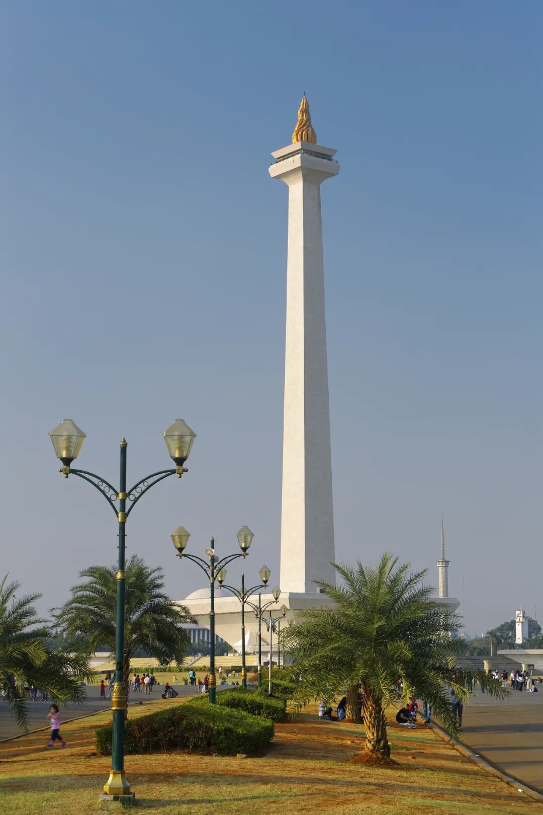 高耸入云的印尼国家纪念碑独立在广场中央,137米的高柱宏伟庄重,直入云霄,碑顶是14米左右高的青铜火焰,据说这簇火焰外足足用了32公斤金箔,碑身上的浮雕则记叙着印尼人反抗殖民统治的英勇事迹,整座纪念碑象征着印尼人对历史、英雄与民族独立精神的尊重。