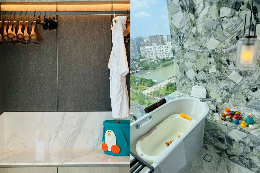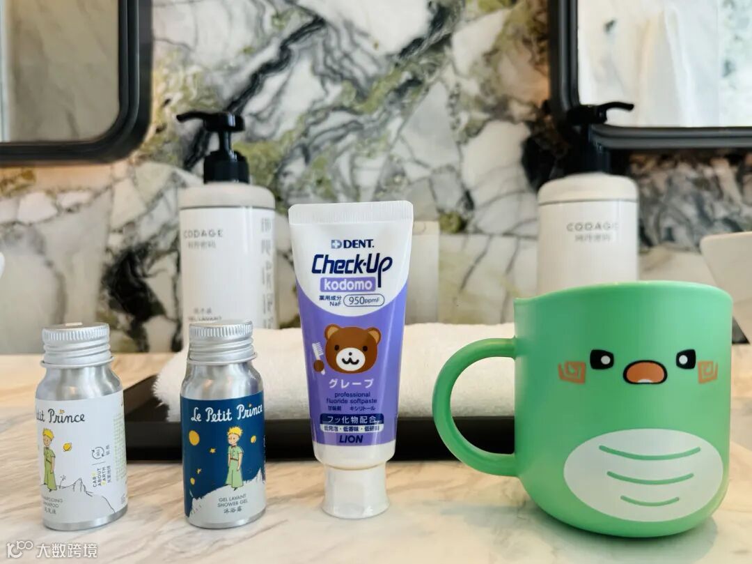 浴室更是可爱炸,玩水的小玩具排排坐,崽肯定快乐的找不到北。房间配了儿童的睡袍,备品。