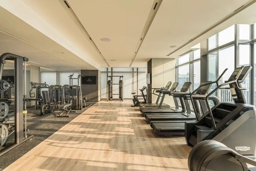 健身房配套很全乎,分有力量器械区和有氧区,配备Technogym品牌专业器械,inbody体测仪、跑步机、史密斯架、龙门架、陆地划船器、椭圆机……简直跟专业健身房有一拼。健身房的一角还能瞥见西湖,这点更加分了。