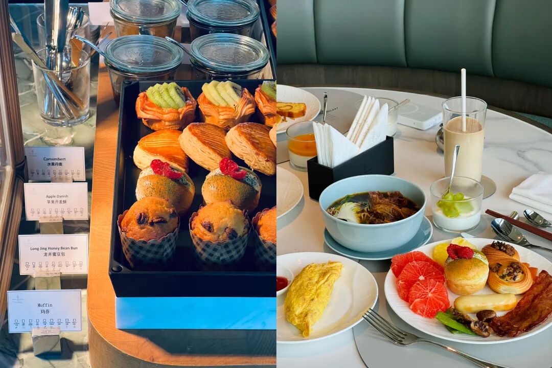 我们早晚餐都是在Charm韵吃的,直接一起讲了,早餐从西式面包、糕点,到中式的点心、粥品、面条,一应俱全,水果好吃给好评。可颂很精致,一度以为是模具。
