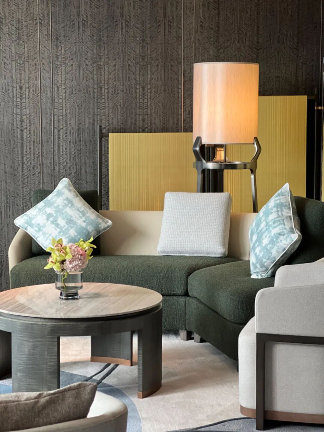 房间风格简单素雅,姜黄色沙发和淡雅软装撞色更显明亮贵气,地毯、床品、屏风等细节处处都是杭州的缩影。