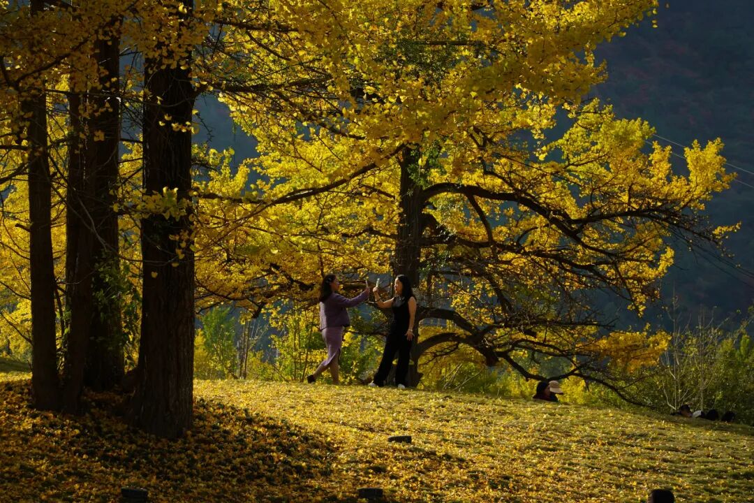 二三村民坐在银杏下闲聊,金黄璀璨的银杏叶装点着秋日,桃园沟满山葱茏,稻谷飘香,一派喜人的丰收景象,浓厚的田园风情让人忍不住想起童年,颇有几分返璞归真的感觉。