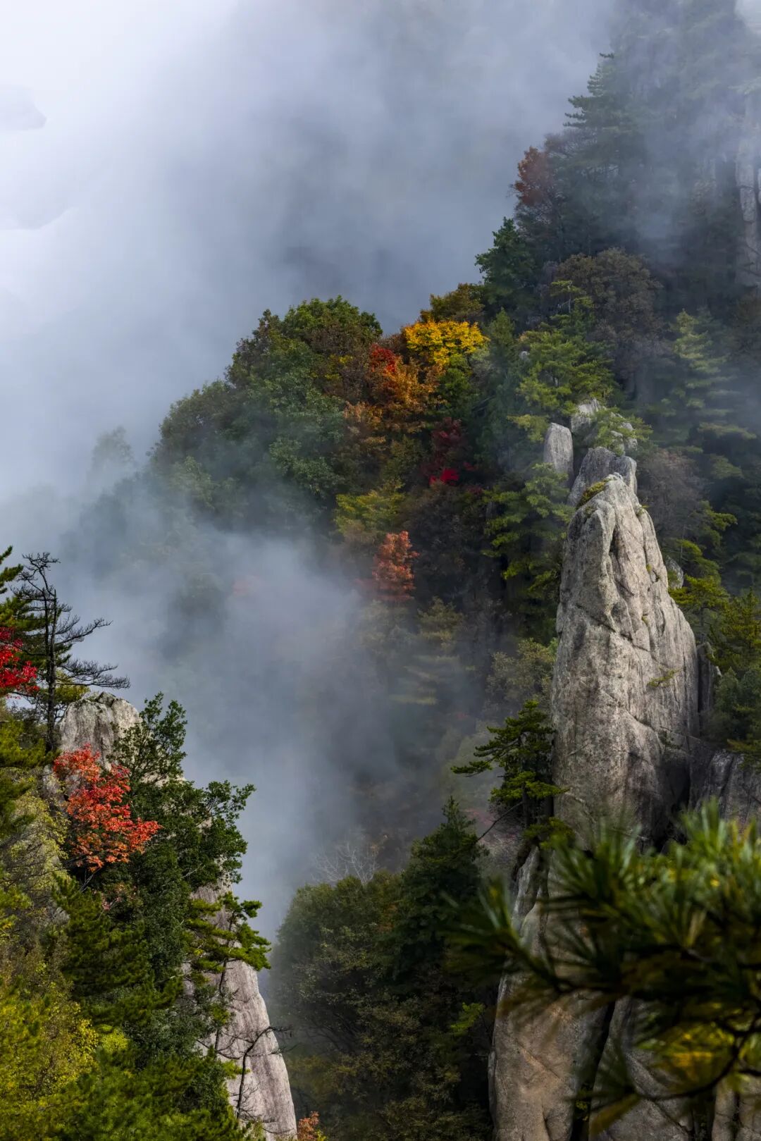 秋雨过后,鸡峰山云海朦胧,是观赏鸡峰山云海的佳期,登顶之后举目眺望,云雾缭绕间山峦若隐若现,群山在云雾中逐渐被秋色浸染,霎时间万山红遍,山色空蒙,犹如仙境一般。