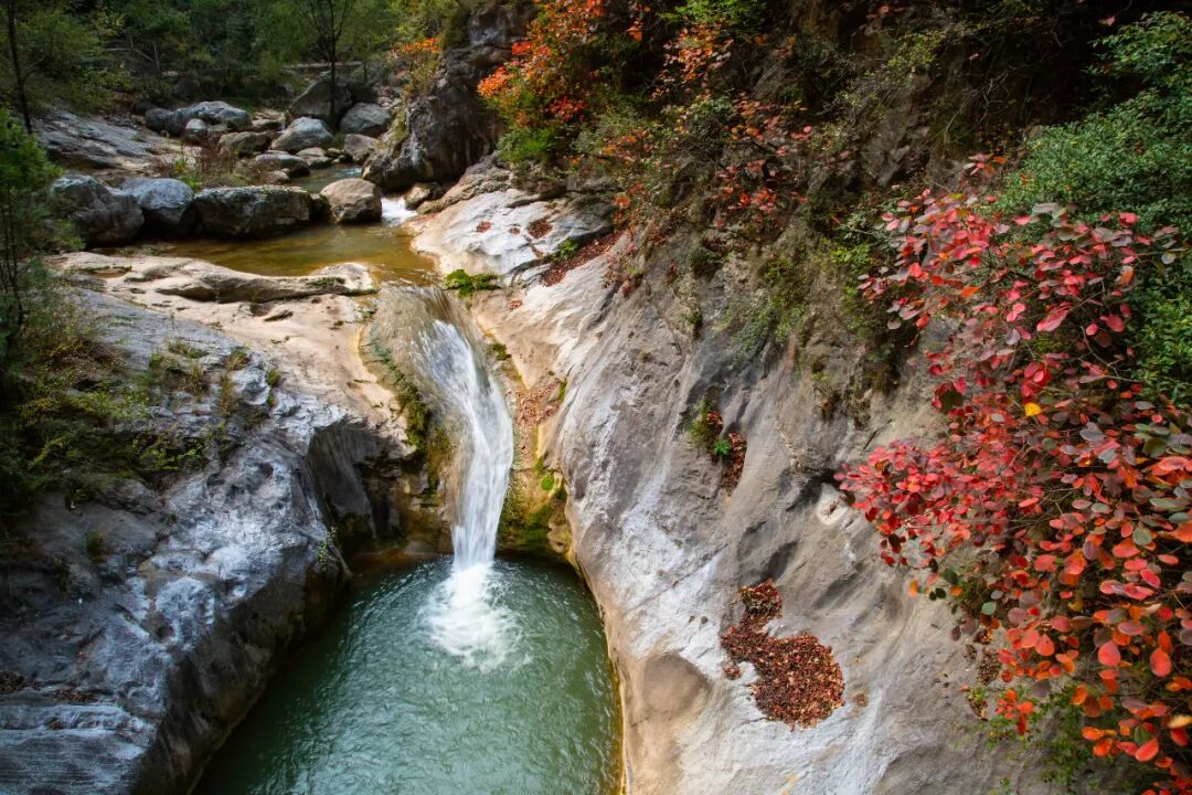 金秋时节,石崖、池潭、丛林与山峰一同构成了五彩斑斓的秋景图,“寒山转苍翠,秋水日潺湲”,沿着石阶沿路而行,古栈道高低蜿蜒,亭台廊桥移步换景,两侧青山峡谷对峙,抬头远望石刻遗迹,俊秀宏伟的峡谷陡然生出些许诗意。