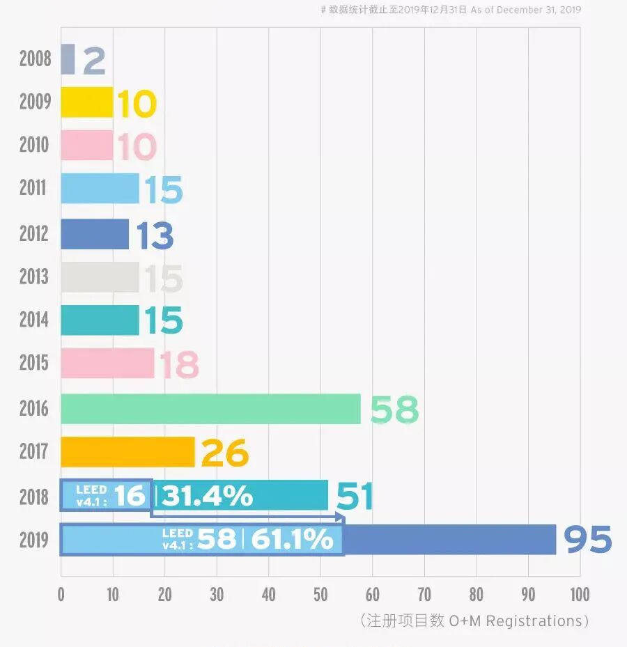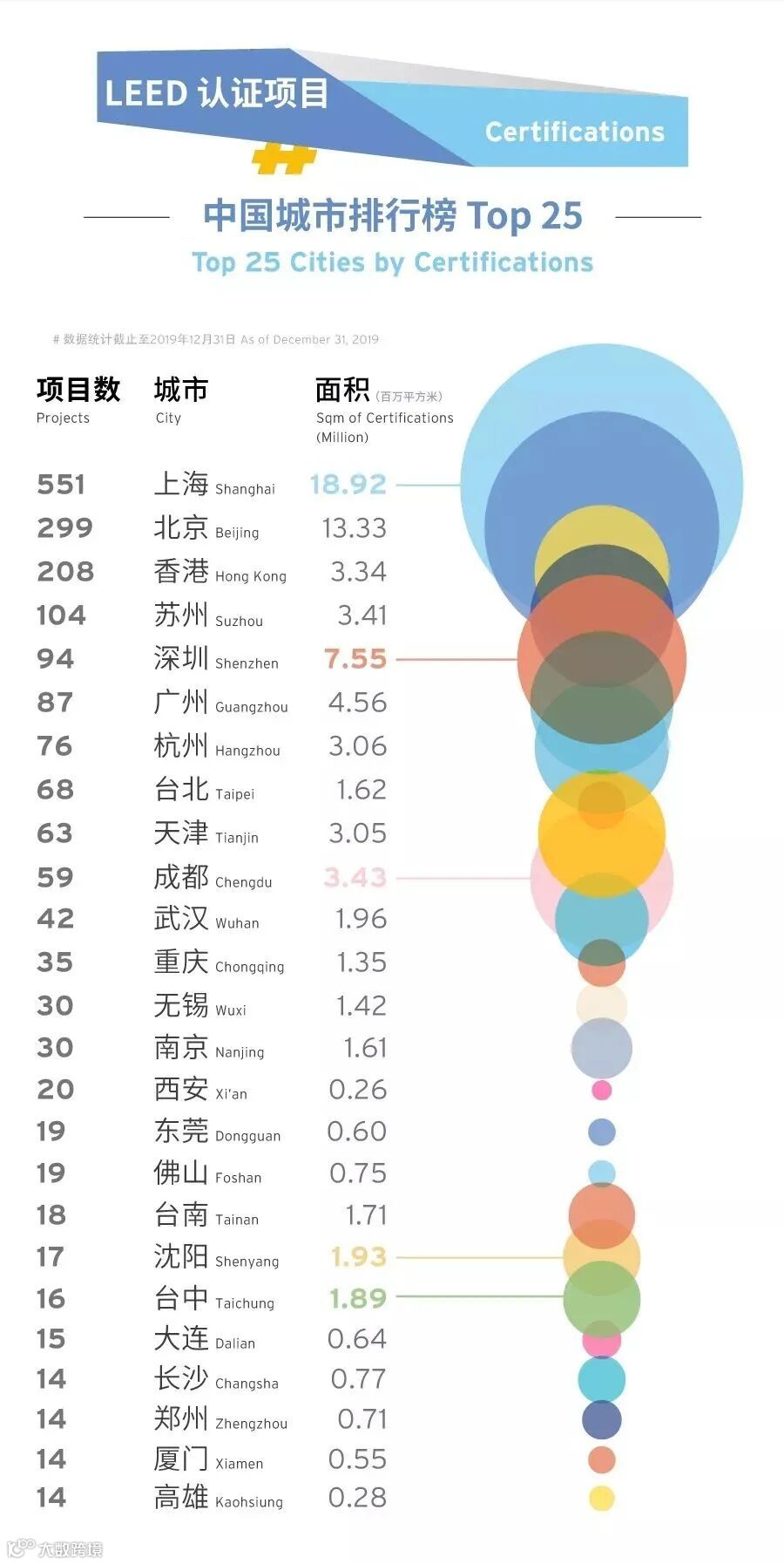 据美国绿色建筑委员会(USGBC)统计,2019年仅美国LEED认证项目申请数量已经是10年前的十倍。这些申请绿建认证的既有建筑项目中,排名前3的城市是:上海、北京、成都。目前中国LEED认证项目数量排名前5的城市是:上海、北京、香港、苏州、深圳。2019年仅LEED认证在中国认证的项目总面积达8800万平方米。