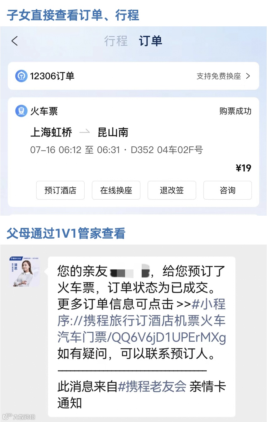 绑定老友亲情卡之后,在老友会频道页帮父母下了的订单,咱都能看到的爸妈行程!要是遇到问题,也同样帮他们咨询专属管家,真正让咱爸妈无忧出行。