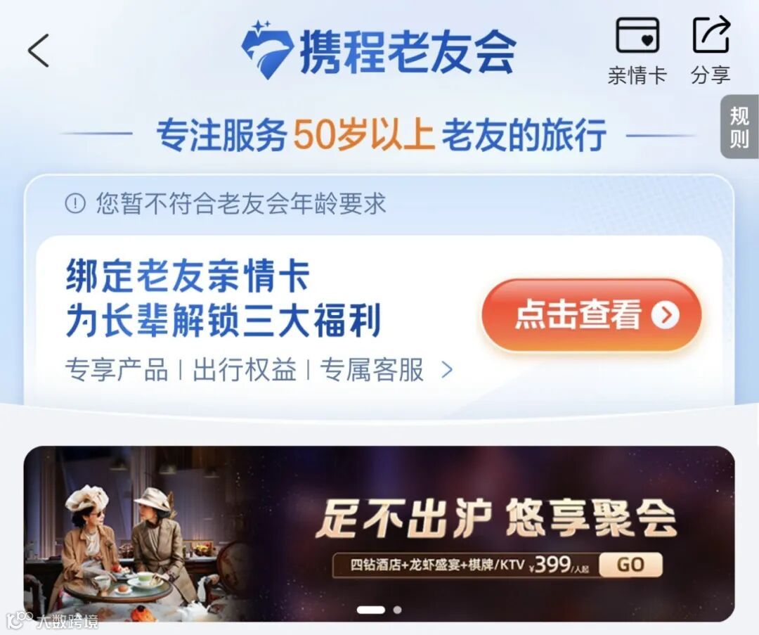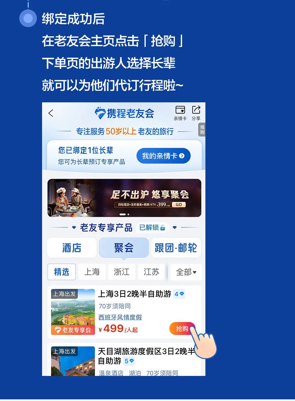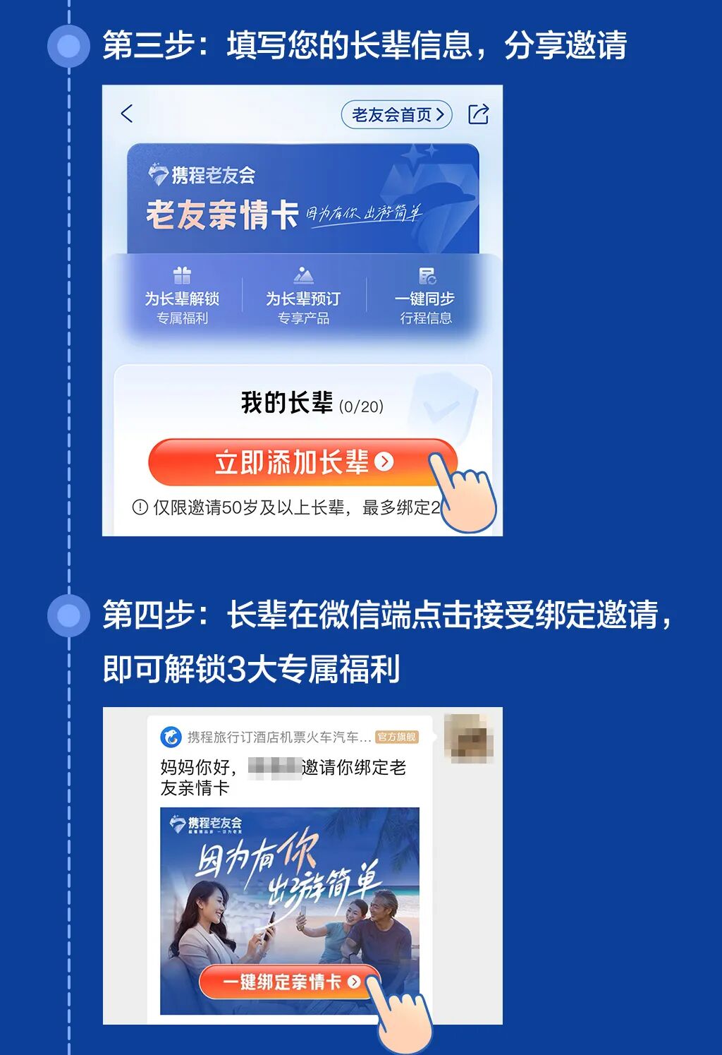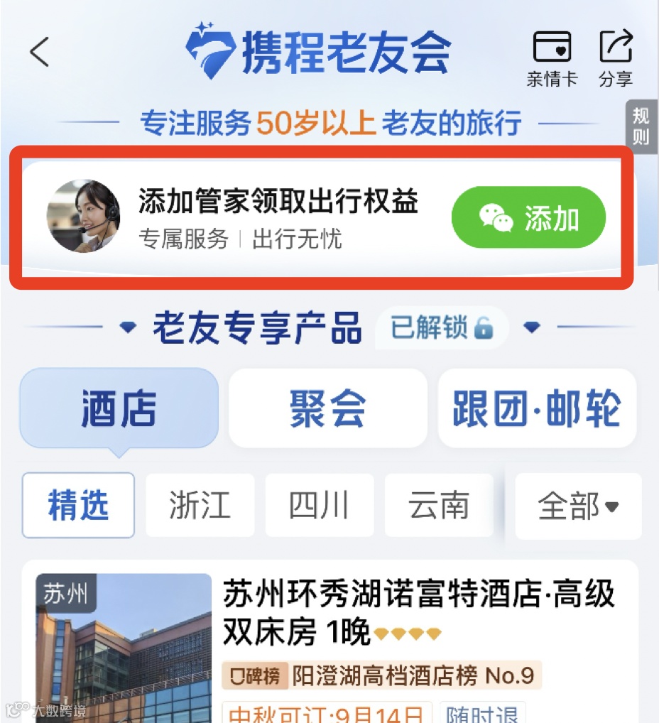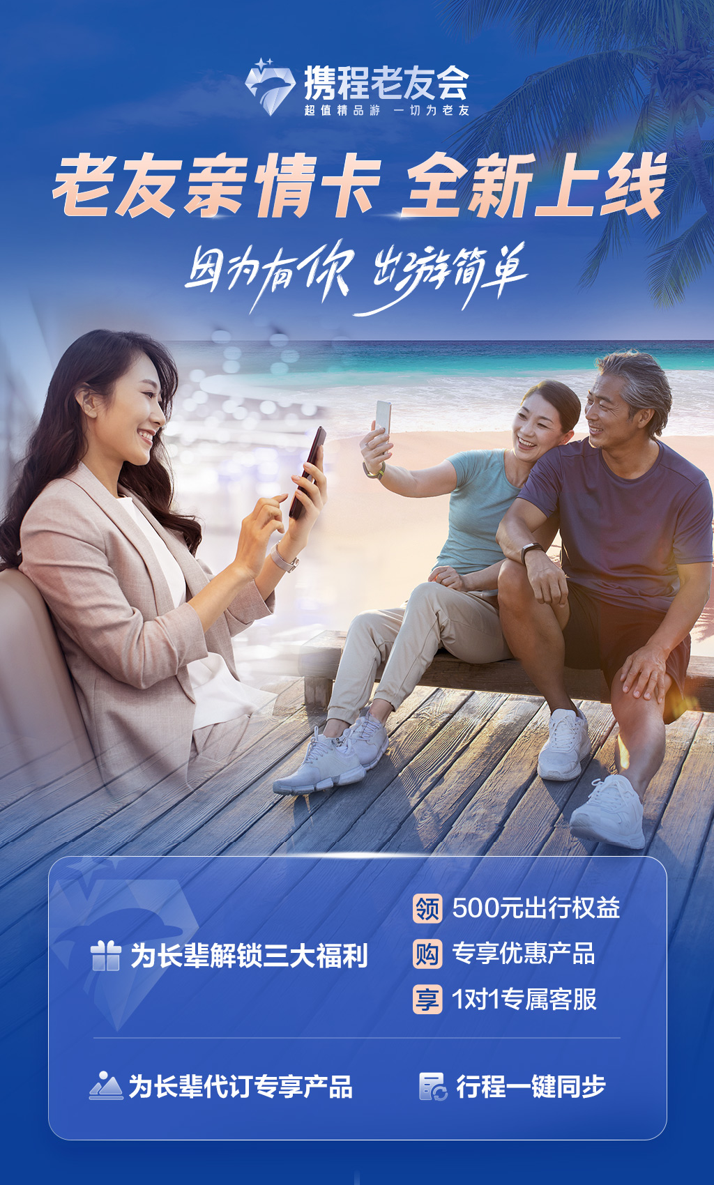 邀请爸妈加入老友会,还能为他们解锁专属福利,包括500元的出行权益,订酒店、机票、火车票都能用上!让爸妈加了专属管家就能领。