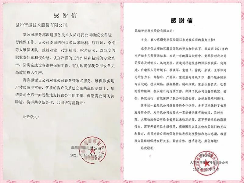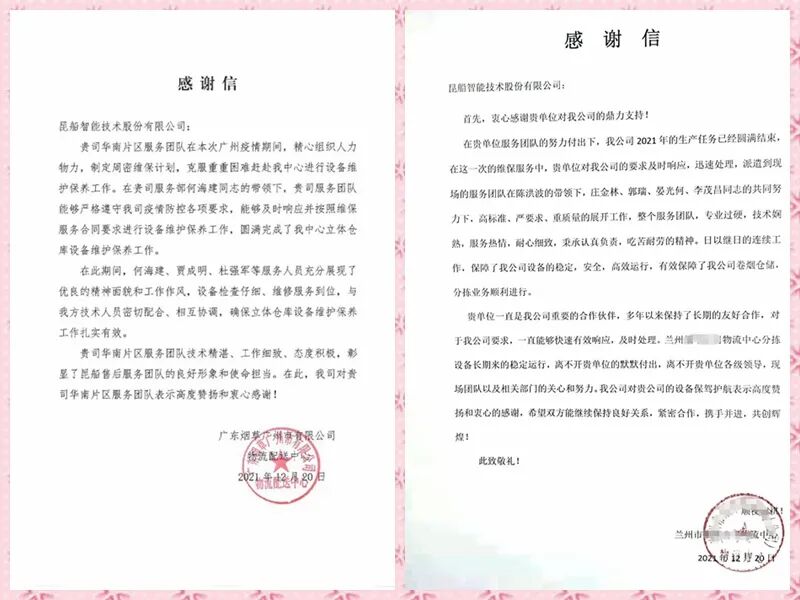 来自用户的每一封感谢信都是对昆船智能服务团队的认可和鼓励,是昆船智能服务团队不断前行的动力源泉,