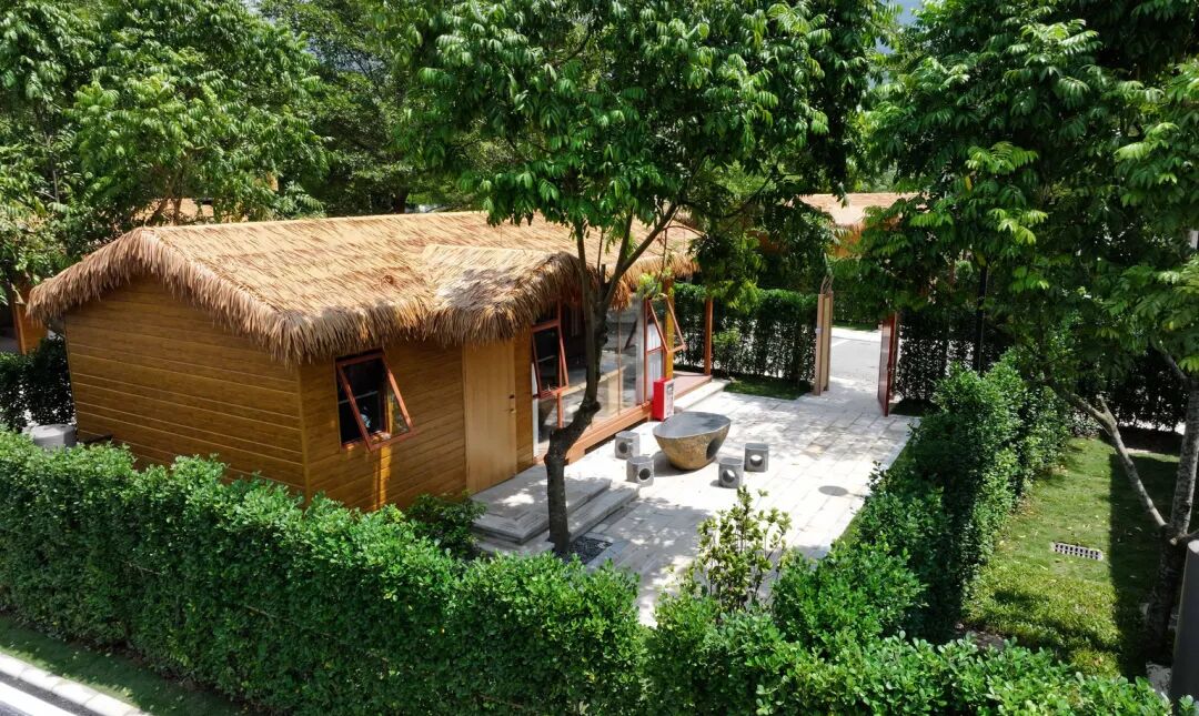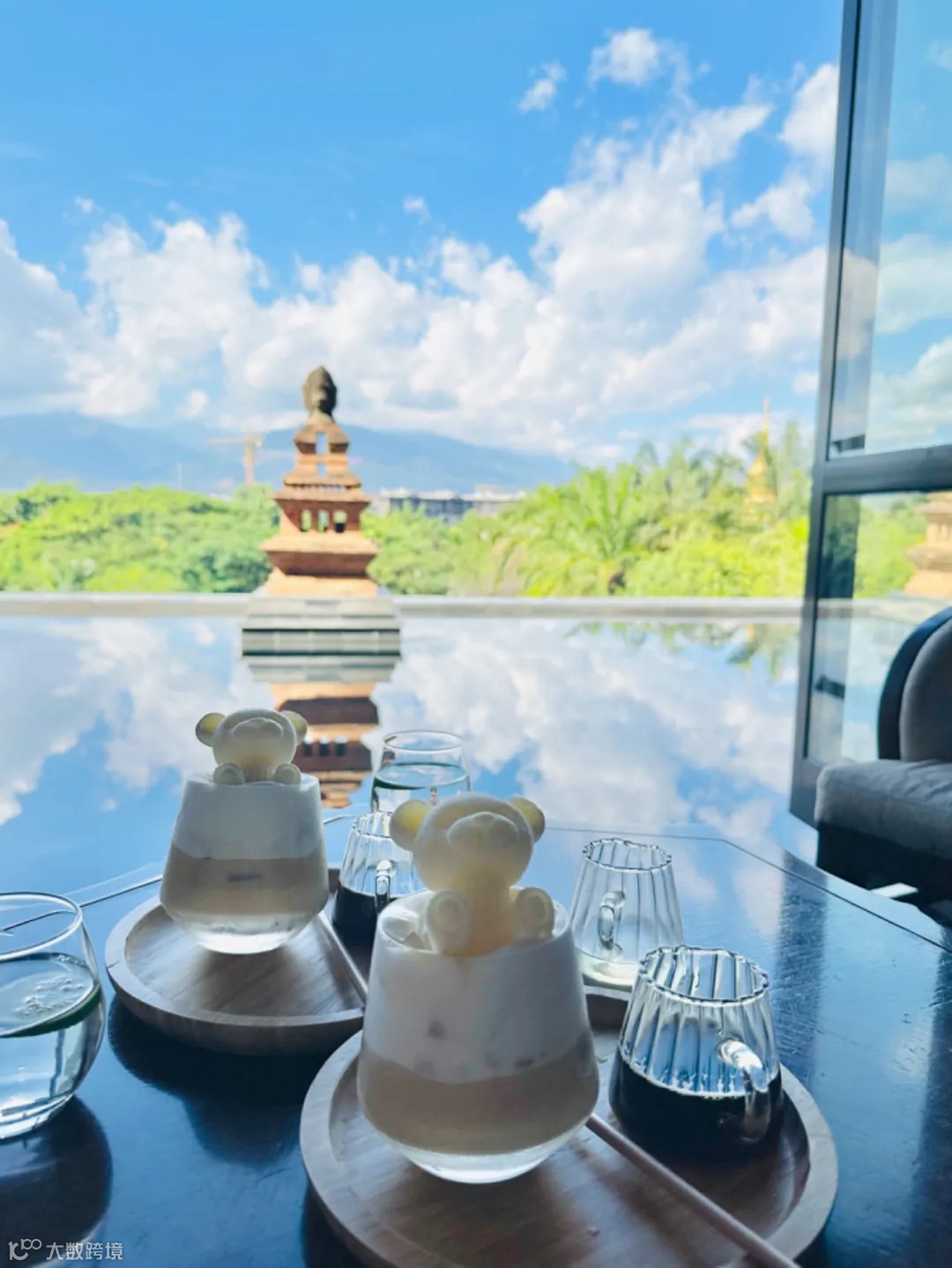 融创度假区里面,万达文华就是尖尖的存在,酒店内以联排别墅为主,自带小花园和私人泳池,住进去瞬间觉得自己就是异域公主!光大堂就美不胜收,我去年还在这拍过照片,就这窗外的碧蓝的天空与热带雨林,喝一杯特制的小熊咖啡,惬意极了!