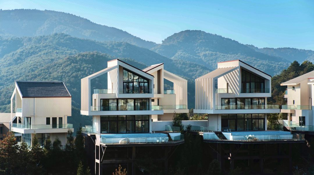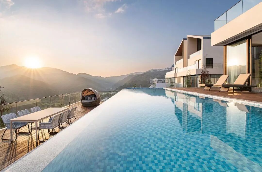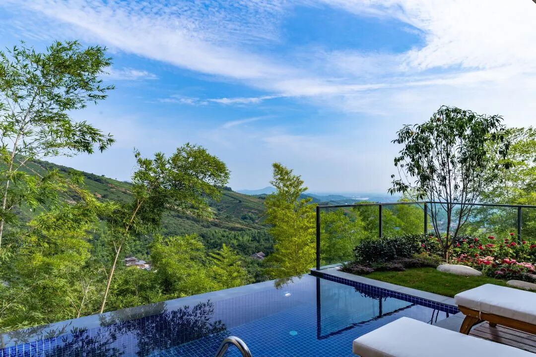 山顶的最高峰是悬崖三卧别墅,300平,蔚蓝的池水与远山交相辉映。在山崖边的泳池里畅游,在躺椅上休憩,抬头便能看到翠绿的山林。