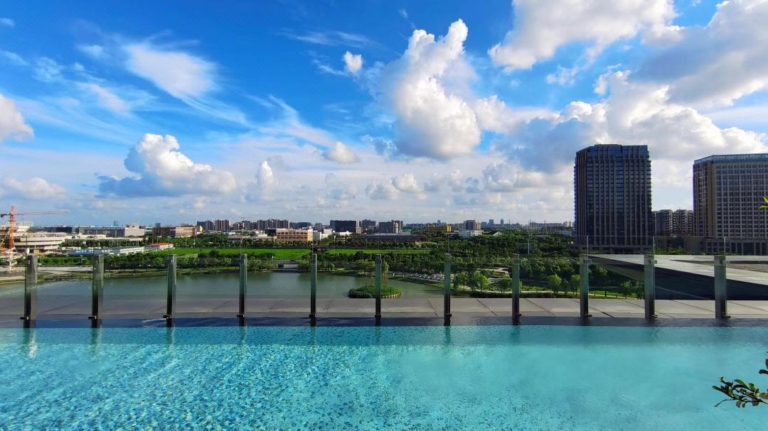 一边在高楼的露天泳池中畅游,一边还能俯瞰到五龙湖美景和城市景观。