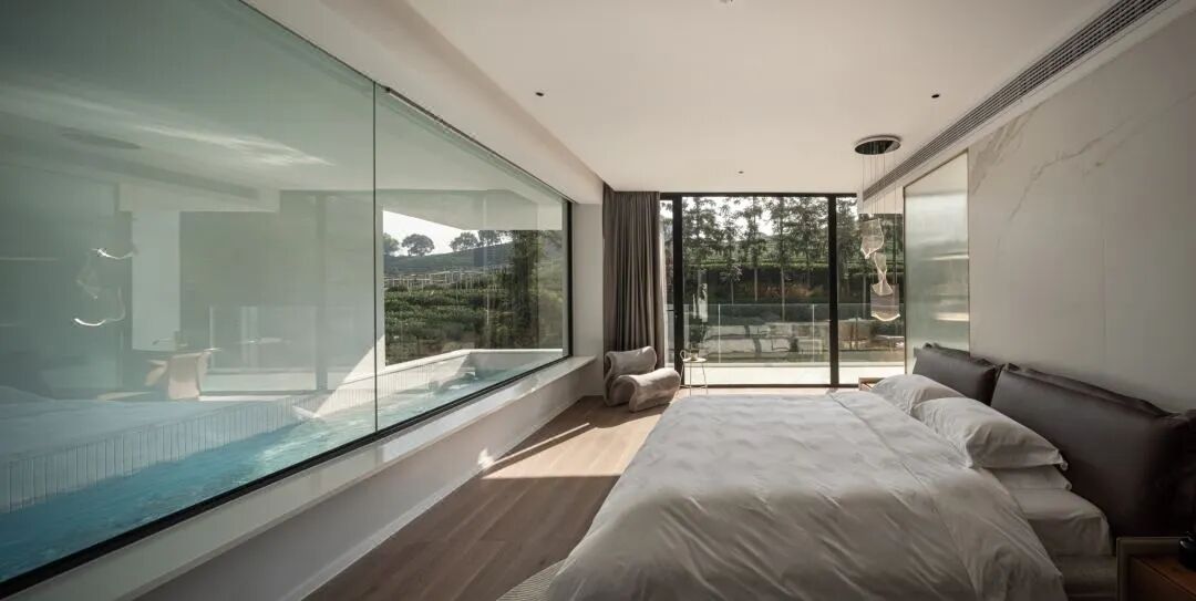 这家的“雪松”Villa,一进门就会被这全透明无支柱的悬空泳池震撼到,200平米超大空间,上下双层,真的做到了足不出户房间内开游,再配上夏日下午茶,这是什么神仙日子!