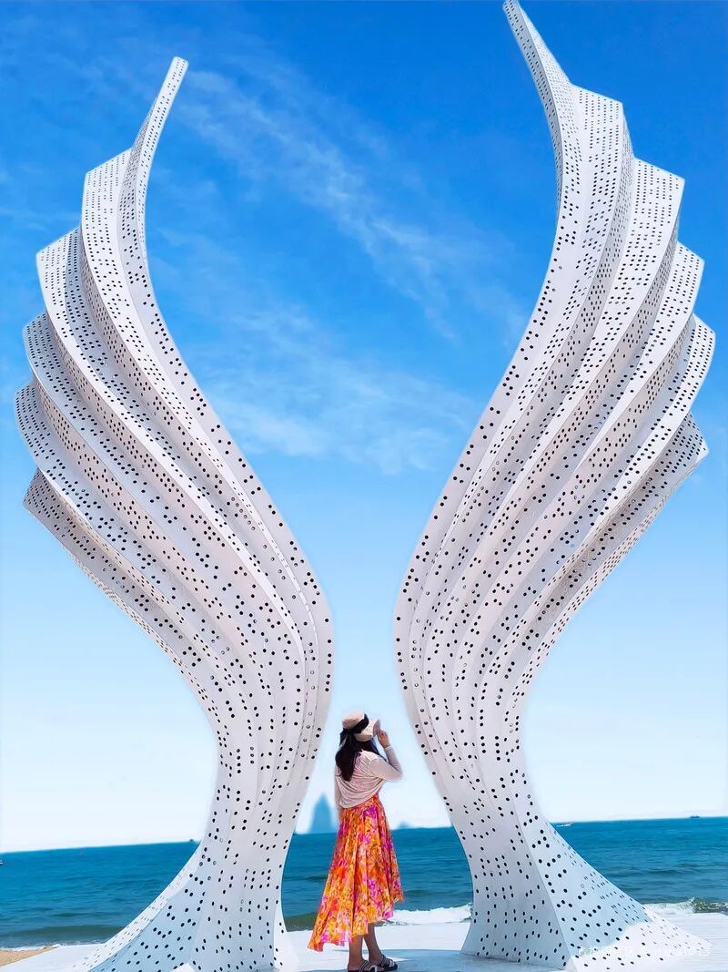 向北约几千米的地方,万平口海滨风景区一带长达5公里的沙滩平坦细腻,海水清澈,配上诸多有趣的雕塑模型,吸引了不少感兴趣的人前来这里打卡踩水。