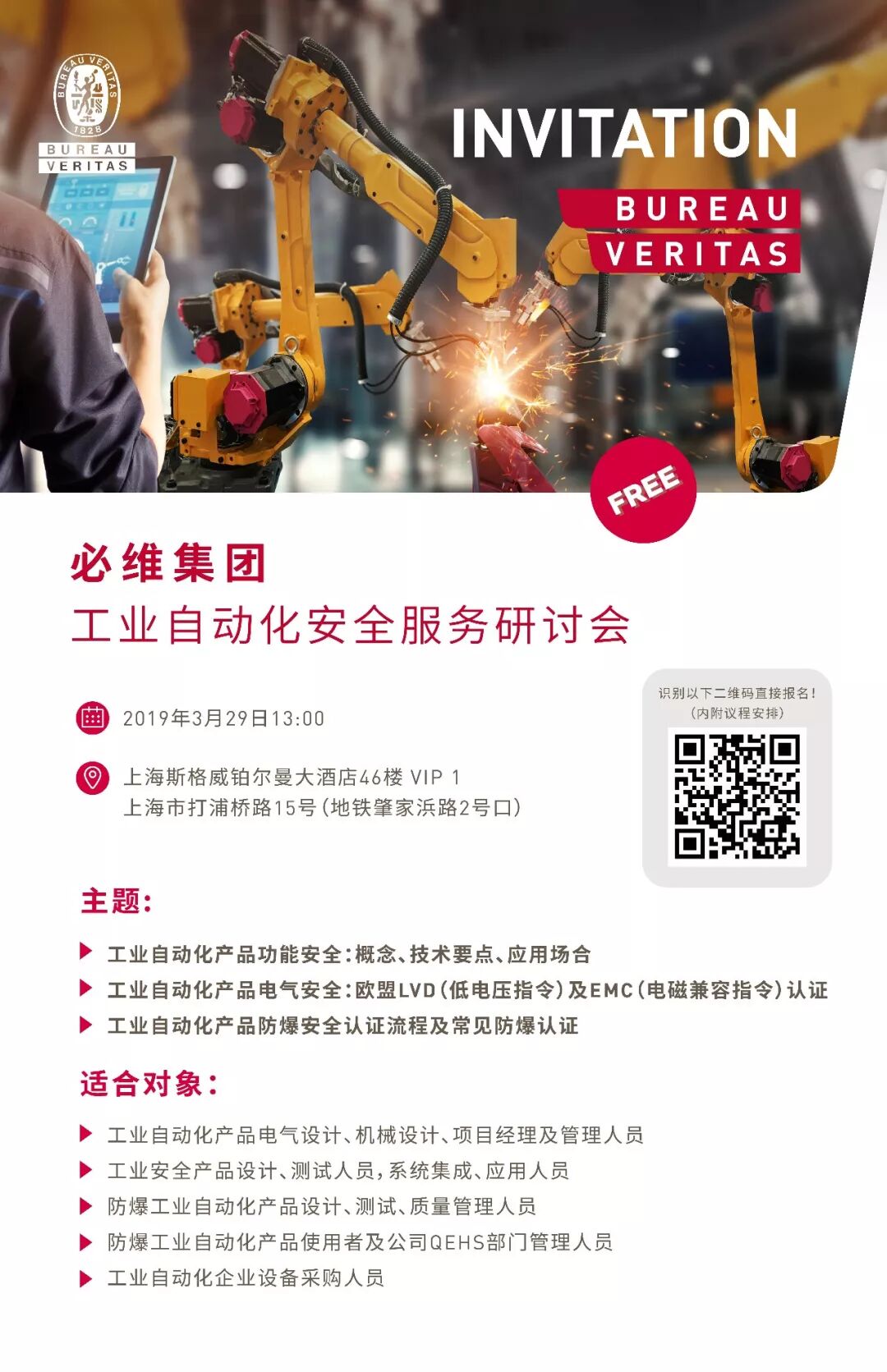 针对工业自动化领域,从功能安全到电气安全,再到防爆安全,必维均可提供培训、咨询、评估、认证系列服务和解决方案。3月29日,必维将在上海举办一场主题为工业自动化安全的研讨会,诚邀工业自动化行业各位专家莅临参加。