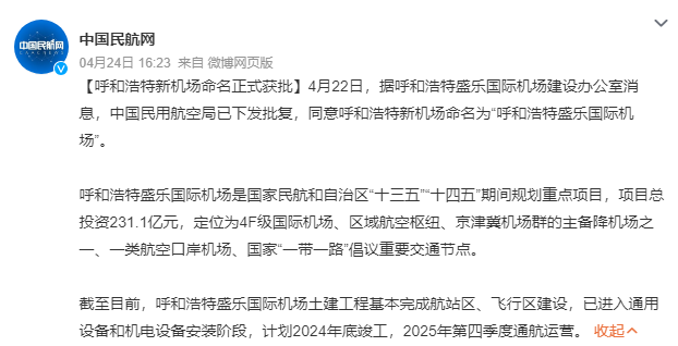继2020年开工建设,时隔4年后,民航局终于批复呼和浩特新机场定名——呼和浩特盛乐国际机场!