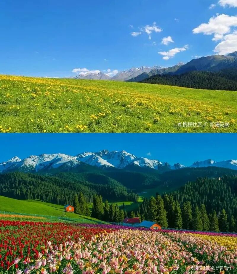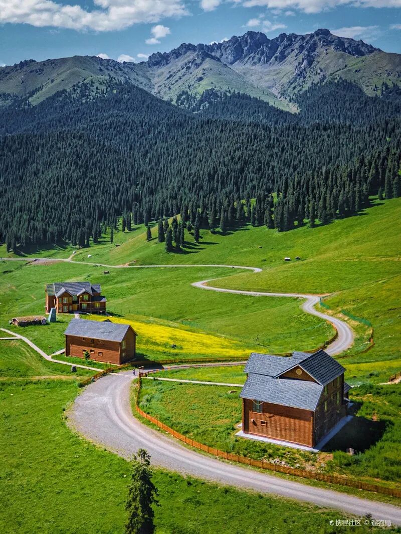 成群的牛羊在草地上觅食,蓝天下原野苍翠,柏松成林,风光丝毫不输瑞士,不少人会选择在这里露营一晚,直面天山雪景,仿佛抬手就能触碰到浩瀚夜空与绵延山脉,清晨被鸟鸣唤醒,遥望草原日出,是不可多得的体验。
