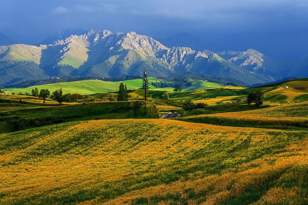 从天山麦海出发,金黄色的麦子在风中摇曳,站在通向情人谷的栈道俯瞰麦海平原,以地为纸、麦为墨,独特的田园风情跃然映入眼帘,与翠绿的高山草甸相映成趣。