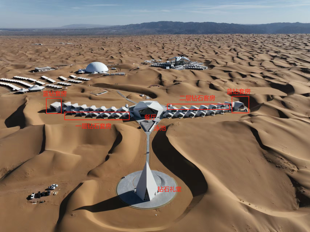 今年5月,沙漠星星所属的中旅度假,再整升级大动作,耗资1.05亿,在星星边上打造了一座钻石酒店。一开业,便刷新沙漠度假天花板。