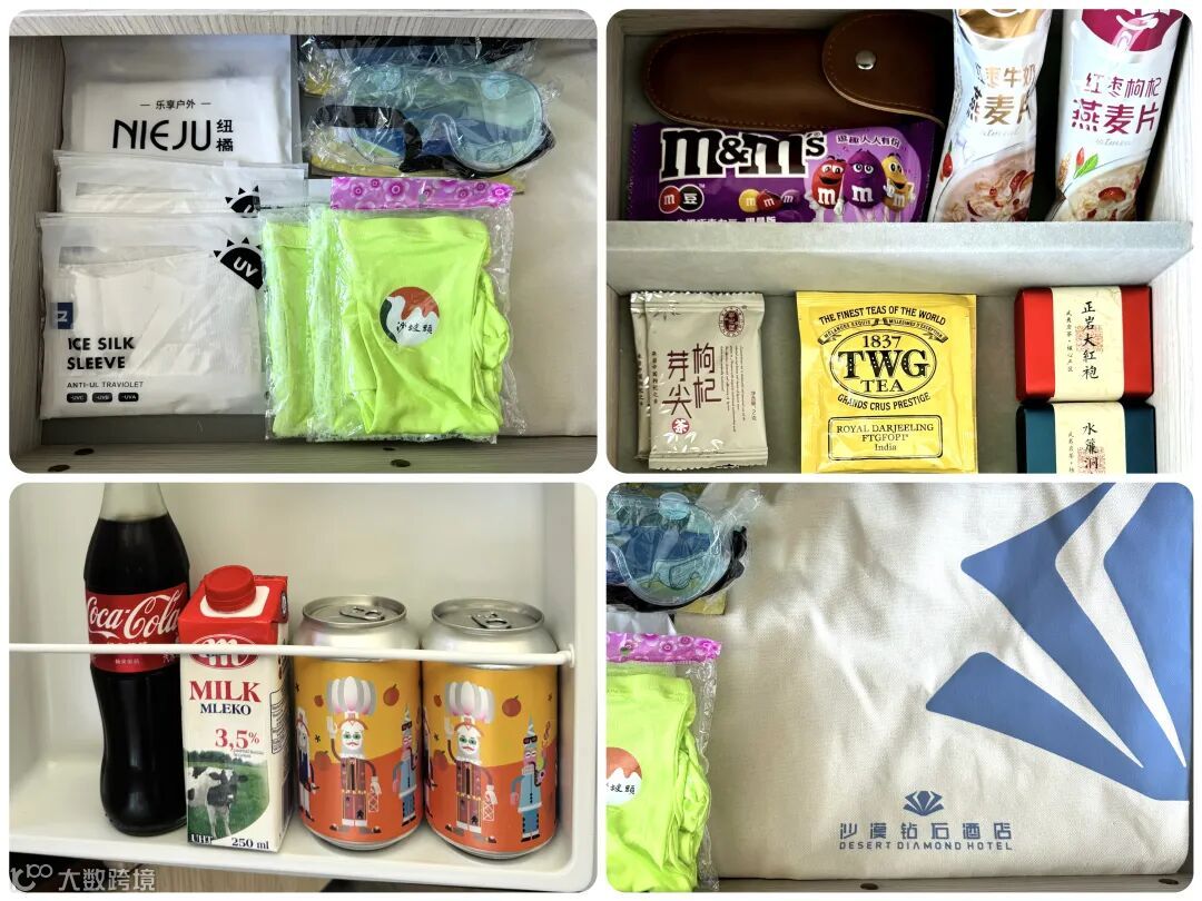 送的也多,迷你吧里基本每天都会补货可乐、牛奶、TWG茶包以及各种巧克力、零食。沙漠里游玩要用到的护目镜、防晒面罩、防晒冰袖、防沙鞋套,也都全部备齐了,还贴心地准备了帆布袋,颇有一种“你用不完请兜着走”的架势。