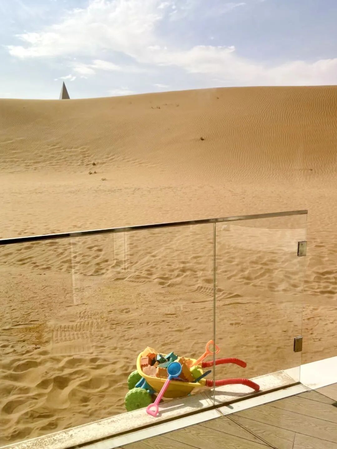 衣帽间、办公区、茶歇区都有,不过我个人最喜欢的,还得是卧室前的三角形阳台。直连沙漠,跨一步就可以挖沙、滑沙。酒店给每个房间配备了一大堆戏沙工具,滑沙板、挖沙铲、小推车等应有尽有,妥妥的“私家沙漠乐园”!别说小孩子能玩一天,大人也很容易“陷”进去。