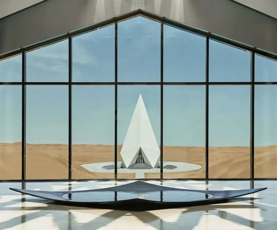 一进酒店大堂,所有人都被面前这扇超大落地玻璃窗吸引了,正对着地标建筑——三菱锥形的钻石礼堂,背景就是湛蓝的天空与起伏的沙丘,现代建筑的几何之韵与大自然的巧夺天工融合得如此完美,沉迷拍照到忘记办理入住,也很合理。