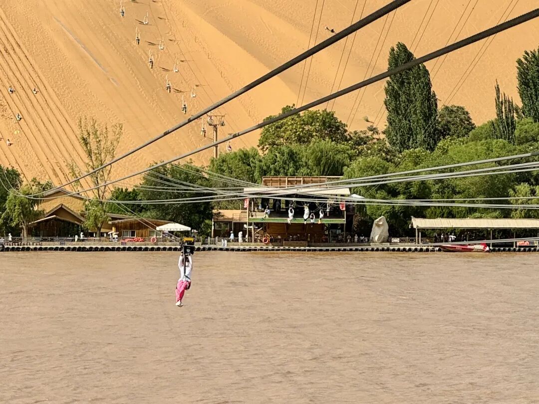 飞黄腾达在黄河区,可以直接从沙漠区前往,20分钟不到的车程,乘坐景区公交即可。百米高空,坐上滑索穿越黄河,看起来怪刺激的,但其实一点也不吓人,本胆小星人甚至能睁眼欣赏脚下蜿蜒的黄河,和面前延绵的贺兰山脉。