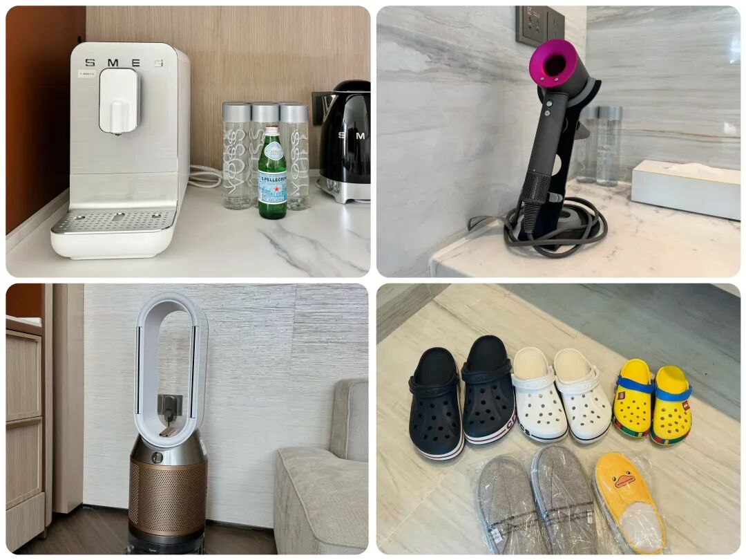 除了硬件顶,房间里的配置也是“壕”无人性。音响是B&W飞艇五代、吹风机和加湿器是戴森的,咖啡机是SMEG的、洗护备品是帕尔玛之水、智能马桶是DURAVIT的,拖鞋是crocs的,就连牙刷都是电动的!