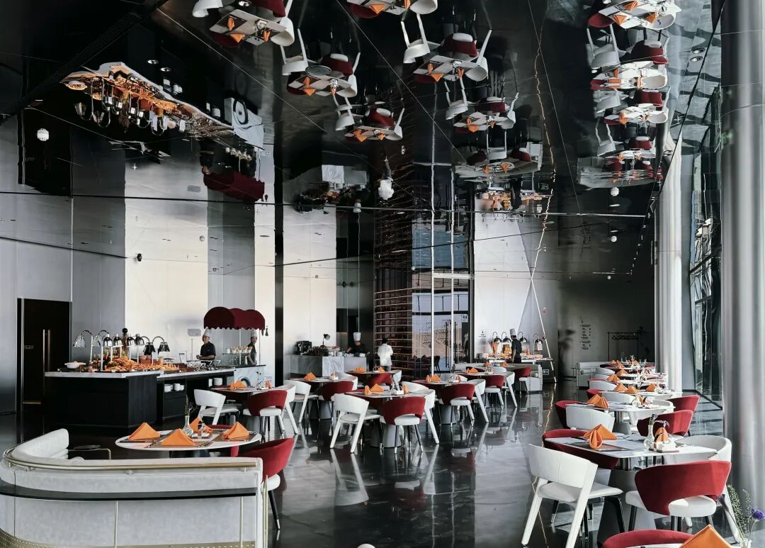 位于一层的黑钻餐厅,镜面设计的天花板,倒映着黑色大理石地面,一整个酷炫。傍晚用餐的话,建议找靠窗的座位,这样可以边用餐边欣赏沙海落日!