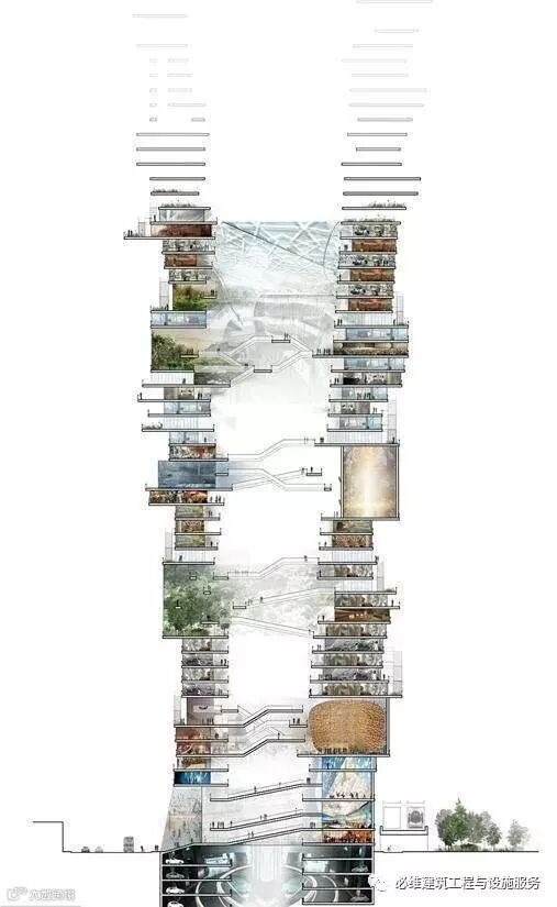 相对于目前普遍的“水平城市”而言,垂直城市是一个多层次、多种功能的超高建筑结构。它包含立体交通、衣食供给、就业机会、垃圾处理、居住环境以及社区存在感等所有的城市功能,其占地面积极小,仅为800平方米左右。没有汽车的城市将实现自给自足,节约能源、减少污染,同时解决土地紧缺、交通拥堵等城市问题,创造健康的生活方式。