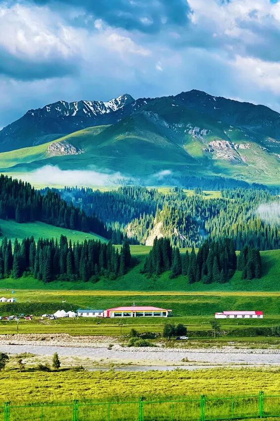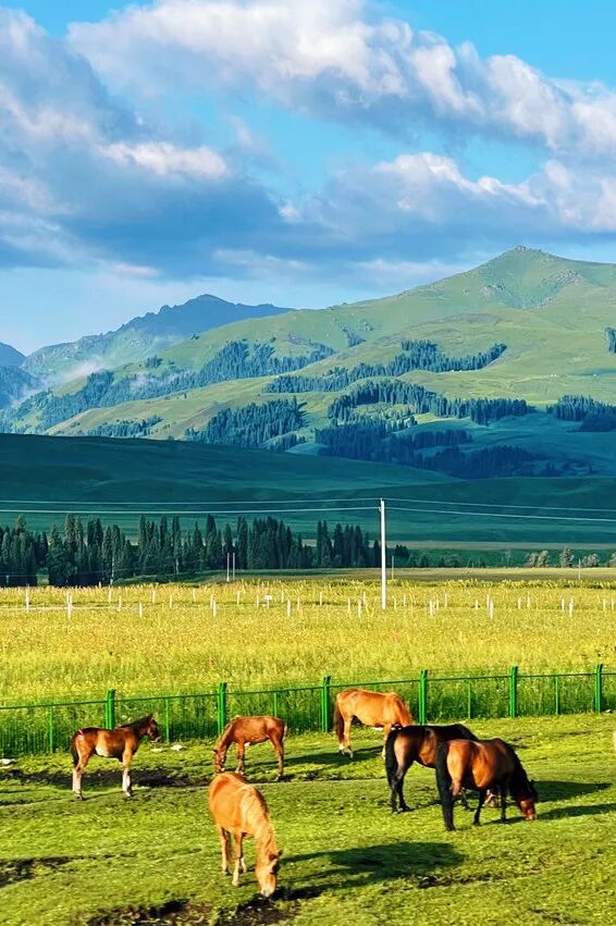 远处的山峦旖旎多姿,近处的草原连绵起伏,仿佛闯入油画般的童话世界,身处其中,耳畔全是自然的呼吸声。晶莹澄澈的河水、随风摆动的绿草,白云雪山、牛羊骏马,所有你从前想象过的,关于草原牧场、田园牧歌的元素,你都可以在这里找到。
