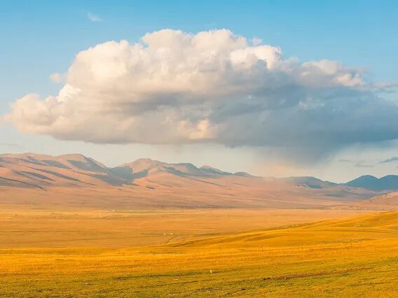 而秋天的巴音布鲁克恍如一个童话世界,每一次定格都是一副色彩绚丽的油画。连绵起伏的山峦与广阔的草原都披上了秋色,远望金黄中点缀着碧蓝,一派秋日风光。